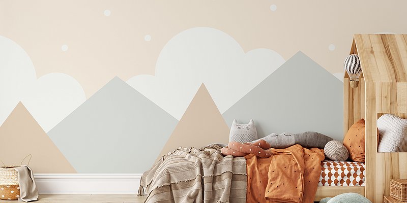 Zarte Töne wie Creme, Himmelblau oder Salbei wirken wohltuend und schaffen eine geschützte Umgebung. Eine dezente Wolkentapete oder eine sanft gestaltete Akzentwand sorgt für Ruhe und ein Gefühl von Sicherheit.