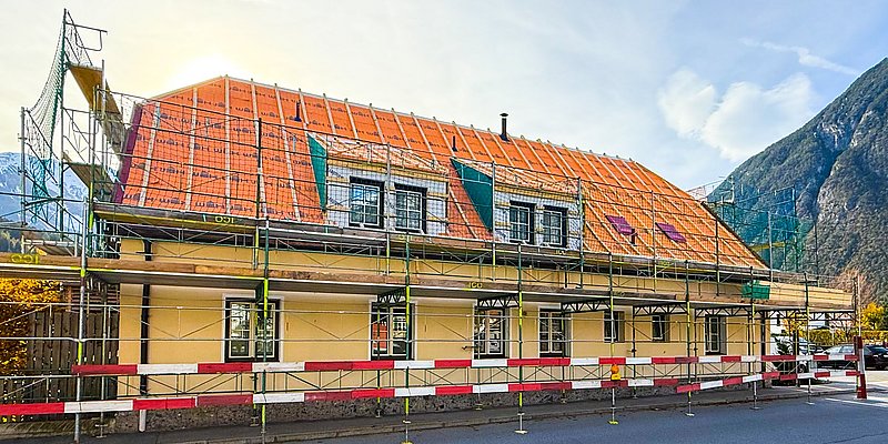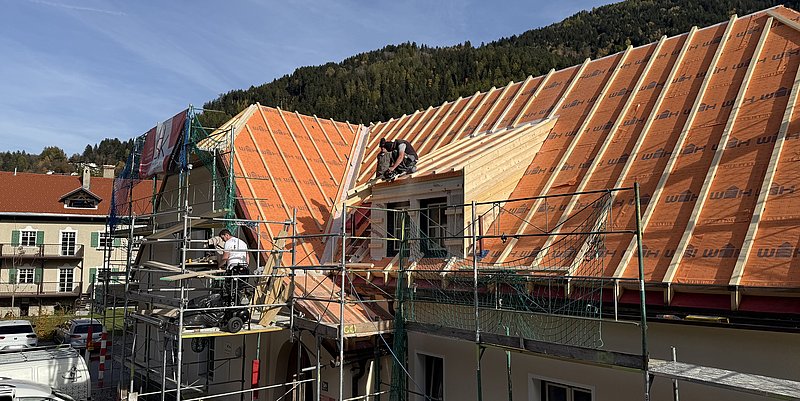 Das Krüppelwalmdach der Caritas Zams verfügt über eine komplexe Geometrie mit vielen Graten und Kehlen. Diese anspruchsvolle Form benötigte eine detaillierte Planung und Präzision in der Umsetzung. Durch die enge Abstimmung zwischen der skzimmerei gmbh, der WH-Fachberatung und der WH-Baustofflogistik entstand ein langlebiger, witterungsbeständiger Dachaufbau, der die Gebäudehülle nachhaltig stärkt.